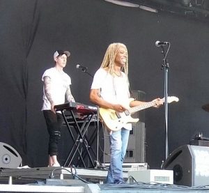 Fredagens headline på Helgeåfestivalen heter Takida. Bandet som tagit hårdrocken till den breda publiken i Sverige lockar givetvis till sig en ganska stor publik. Det är lite svårt att bedöma hur mycket folk det är för det är en luftig och stor yta vi har att samlas på. De samlar i vilket fall som helst kvällens största publik.
