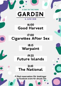 Fem band på en konsert på Nationaldagen, avslutas med The National.