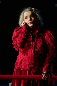En åldrad fröken Julie, (Marie Göranzon) ännu vacker, befallande och medveten om sin börd. I glansig röd kjol och voluminös jacka intar hon scenen och förväntar sig lydnad och att få sällskap i midsommarnatten.