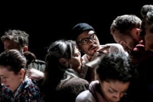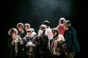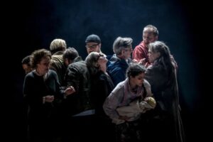 Regissören Sofia Adrian Jupither är en erfaren Norén-kännare som totalt satt upp sju pjäser av hans, nu senast Vintermusik (2017) och Episod (2019). Hennes gestaltning och återspegling av Noréns text är stram och avskalad. På scen ser vi tio individer, ibland upplysta av scenljusets sken, ibland dolda av en dov belysning som silhuetter i mörkret. Packade som sillar i en sillburk står de där. De vet inget om varför de placerats här. Bär de på skuld, har de begått brott och ska straffas därutefter eller står de alla tålmodigt i väntekön till dödens rike?