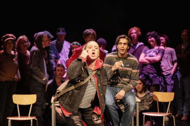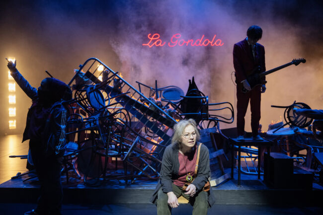 Uppmärksamma läsare har lagt märke till att kvinnan född i Tyskland haft mycket att bestyra i denna produktion i och med ansvar också för scenografi och kostymdesign. Hur scenen inretts är helt klart en positiv komponent. En sorts förlängs bröllopsnatt illustreras med vita fladdrande gardiner, massvis med staplade madrasser möjligen symboliserande ostadig förälskelse, en fond av videodesign på lummig skog och vindkraftsnurror och i förgrunden en lång bänk belamrad med kaffekoppar. Några gånger klivs det över den och upp på läktaren. Andra faktorer som skapar mervärde är lustigt synkade koreografi och den specialskrivna musiken.