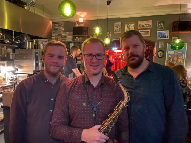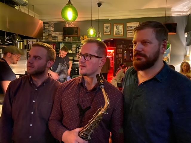 Värt att skjuta in att Thurfjell och Thomas Jäderlund körar och sjunger på åtskilliga låtar. Av mina anteckningar framgår att jag kunde uppfatta sofistikerade, fullödiga arrangemang. Dagen före hade man repat rejält för att få ihop alla delar, vilket märktes. Nästa sång, Balladernas konst från Majakovskij-projektet vars dikter översatts av Harding/ Bergström och tonsatts av Goldberg/ Forssell/ Näslund inramas av suggestiv kontur. Musiken närmar sig slavisk folkmusik, rent av cirkusatmosfär. Med enorm kraft stretchar Jäderlund i ett vildsint solo som drar ner applåder.