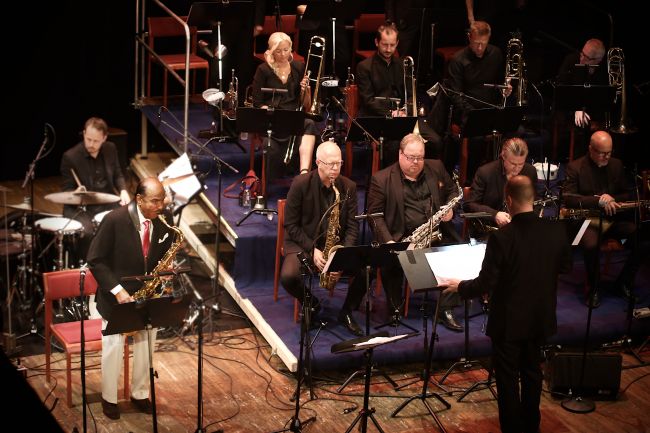 Ett program man omöjligen kan ha invändningar mot har rubriken Jazz på svenskt vis. Ånyo är festivalens konstnärlige ledare i elden. En ynnest att få njuta av JAN LUNDGREN TRIO , liktydigt med kompanjonerna Mattias Svensson (bas) och Zoltan Csörsz Jr (trummor), i samverkan med GOTHENBURG WIND ORCHESTRA, en professionell blåsorkester på 22 personer. Som deras förste framstående solist utför Robin Rydqvist (ingår också i BBB) hjärtknipande spel på flygelhorn. Från en otroligt intressant repertoar kan framhållas kompositioner av Nils Lindberg, Jan Johansson, Bengt Arne Wallin, Bengt Hallberg, Evert Taube; till och med Lasse Dahlquist och Alice Tegnér. Det mycket fruktbara samarbetet inleddes närmare två år tillbaka. Det vibrerar i så hög grad av fusionen, att idén har omvandlats till ett genialt resultat. Rikhaltiga schatteringar frammanas av fullödiga arr, av bland andra Martin Berggren, Ann- Sofi Söderqvist och Anders Ekdahl. Ömsom ystert lekfullt när svängar tas ut, ömsom ljuvt djupdykande ner i folkkära toner. Orkestern jag ofta hört live på hemmaplan, skrider till verket taggade och rutinerade. Fantasifull underhållning förenas med obestridliga konstnärliga värden. Den vitklädde trumslagaren får feeling, kastar eventuell försynthet överbord, drar igång ett lika minnesvärt som spektakulärt solo. Och därefter vistas han på en annan planet resten av konserten. Stort att få vara med om. Hur Jan Lundgren kan koppla bort allt runtomkring och lägga urtjusiga ackord i exakt rätt ögonblick förblir ett mysterium. Tajmingen från honom och övriga musiker var fantastisk hela vägen, fram till och med roliga extranumret Bä bä vita lamm.