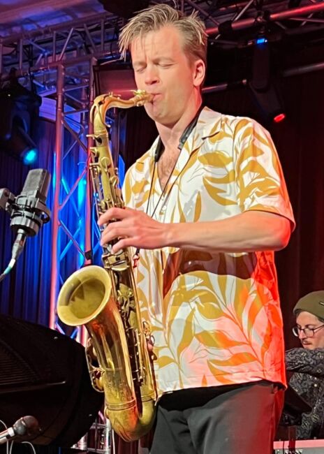 Medmusiker på pågående turné är Magnus Hjorth vid flygeln som nyligen satt på samma scen och ackompanjerande Karl Olandersson, trumslagaren Anton Eger (Jazz Kamikaze, Django Bates, Phronesis mm.) Elliot Galvin på synt/ keyboard som jag sett med Dinosaur samt vikarien Kaspar Vadsholt på elbas och till vardags i Danish Radio Big Band Av övriga uppdragsgivare kan nämnas Jens Winther och Hans Ulrik. Under avdelningen fakta ska också framhållas att arrangörens ordinarie ljudtekniker lyckas förträffligt, trots klagomål om alltför lite tid för soundcheck. Behövde inte ens öronproppar. Den virtuosa saxofonisten låter genomgående musiken tala, varför jag bara vid enstaka tillfällen kan ange låttitlar.