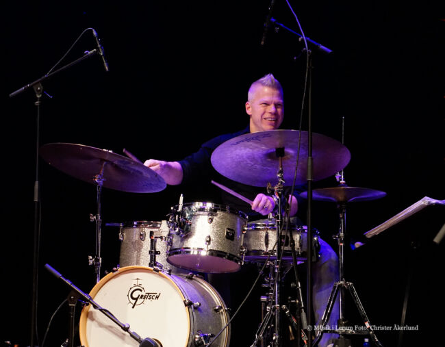 Rytmsektionen är fantastiskt tajt, otroligt följsam och understödjer alldeles lagom. Dessutom hörs från basist Mattias Svensson ett antal formidabla inlägg, både elförstärkta och akustiska. Utses därför till eftermiddagens överraskning, växte ut till en gigant genom suveränt dekorerande i passande passager. Ändå var basen lite lågt mixad inledningsvis. Ljudet var överlag mycket behagligt. Fast huvudpersonen begärde justeringar flera gånger. Och ibland uppstod en smula obalans, vilket missgynnade volymsvag flygel. Se det sagda som påpekanden i marginalen.