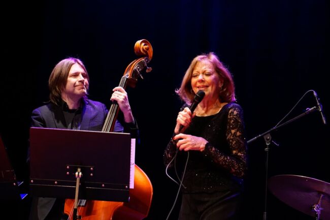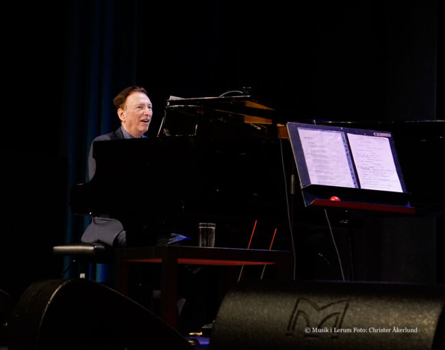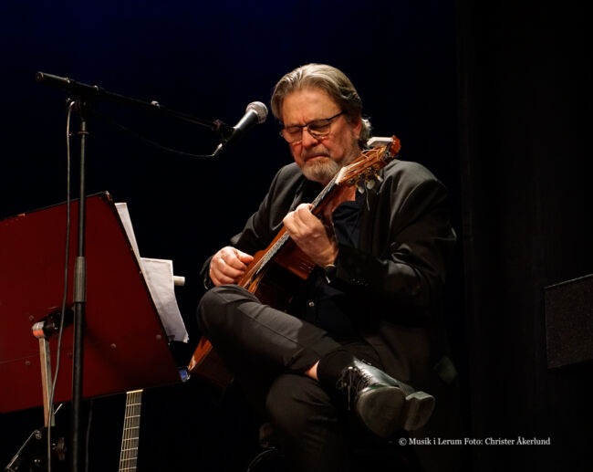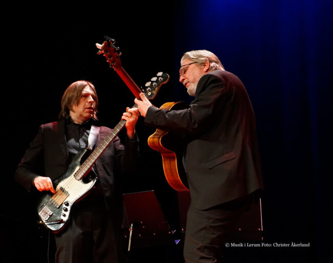 Med kvintett avses jämngamla eleganten Claes Crona vid flygeln med meriter från en lång rad samarbeten med storheter, Johan Löfcrantz Ramsay (träffade honom veckan före efter konsert med Peter Asplund Aspiration) bakom trummorna, Mats Norrefalk på gitarrer samt för den här turnén nytillskottet Mattias Svensson på kontra- och elbas. Om jag är korrekt underrättad ansvarar antingen Norrefalk eller Crona för finessrika arrangemangen. Har haft förmånen att höra herrarna musicera ett otal gånger, fast inte tidigare tillsammans. De tillhör givetvis översta skiktet i landet på sina instrument, bildar ett närmast osannolikt stabilt gäng, lyhörda för infall. Att stjärnan som maximalt fyller Dergårdsteatern ansvarar för låtlistans utformning inklusive sammanbindande mellansnack/ recitation råder ingen som helst tvekan om. Självklart bjuds på soloavsnitt, features, läckert groovy duell och från Mats Norrefalk medryckande uppvisning på egen hand i La Partida (komposition från Venezuela) på soprangitarr.