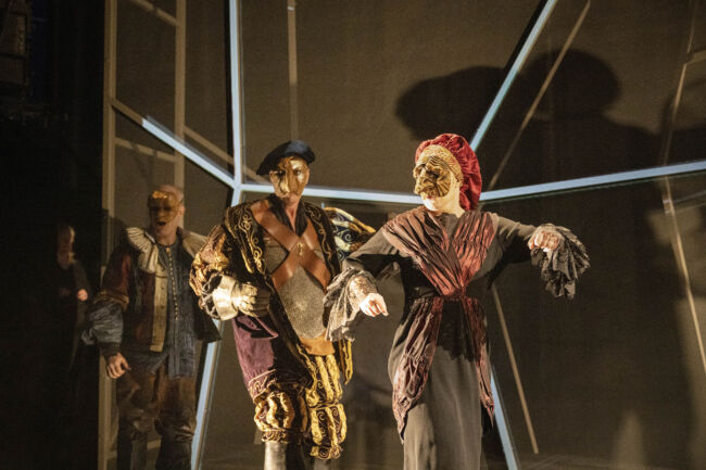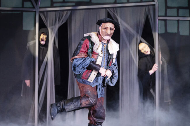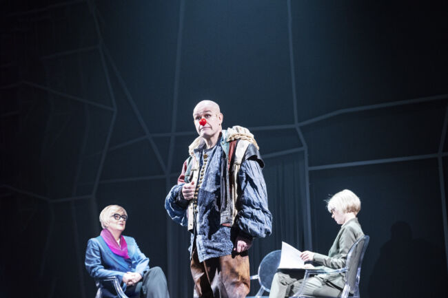 Beräknade längden på tre timmar inklusive paus utgår från att ungefärlig uppskattning av fullständigt improviserade moment bakats in. Hade velat fråga sufflösen, ynglingen utsedd till ”offer” och möjligen scentekniker hur många av de till synes spontana avvikelserna som var överenskomna. Pjäsen börjar med att en hasande huvudrollsinnehavare med barnslig röst berättar vad som är närmast förestående, när han regisserar sig själv och sin lilla trupp skådespelare i Hamlet. Är du inte förtjust i ideliga omtagningar och aktörer med masker, vilka reagerar blixtsnabbt på stimuli, avråds införskaffande av biljett. Då framstår nog denna brokiga pjäs med sina många lager mest som tröttsam och infantil.