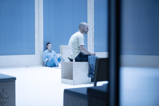 Har sannolikt varit en rejäl utmaning för hennes motspelare Jesper Söderblom att vara så avvaktande och icke-verbal. Torde vara extremt ansträngande att instrueras agera återhållsamt, med endast glimtvisa utbrott. För mig har han varit en favorit i drygt ett tiotal ledande roller under sin tid i fasta ensemblen. Vrede och resignation går här hand i hand, endera uttryck väger över. Övertygar allra mest genom att framhäva oberäknelig aspekt och hur Frank plågas, Rollfigurens tillstånd efter en alltmer ensidig uppgörelse, framställs ned obönhörlig skärpa, i successivt framtagna rörelser vilka indikerar att han imploderar.