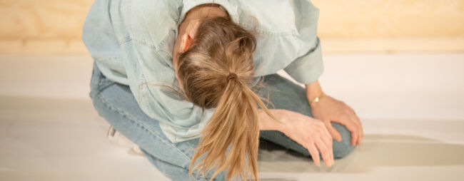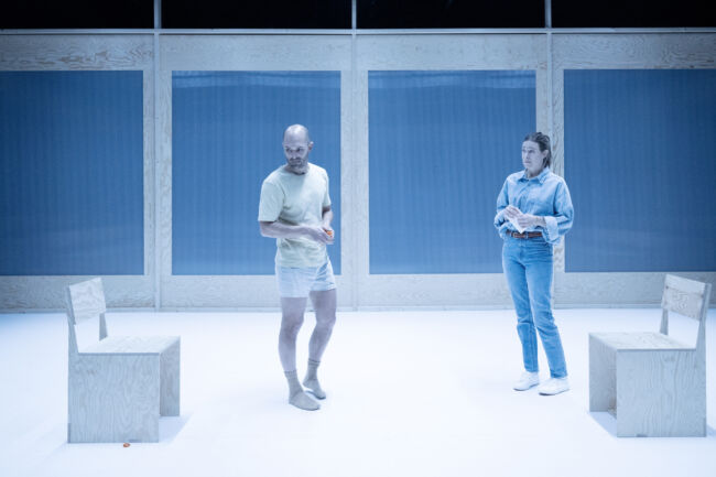 Enaktaren sätts upp längst ner i en del av teatern som renoverades för några år sedan. Nytt för denna produktion vars premiär var uppskjuten, är att publiken sitter på två bänkrader i tre väderstreck. Vi sitter tätt, i längden tämligen obekvämt för ryggen. Det är nog ett avsiktligt grepp för att vi ska känna oss drabbade av den gradvisa perversa påspädningen av ett arbetsgivarkontrakt, den process av lidande som pågår på scen. Åskådarna kommer förmodligen närmare skådespelarna än vad som någonsin skett i huset, på ett sätt som påminner om hur Backa Teater ibland inrättat publikplatserna. Scenografin är minimal med två stolar i trä, en vägg med träribbor vars öppna fyrkanter är överdragna av plast. Den minst sagt sterila miljön belyses med skarpt vitt ljus. I exceptionellt hög grad går K. Polyfons estetik ut på att kontinuerligt upprätta överenskommelser med publiken. Också så som pjäsen skrivits krävs det att vi föreställer oss ett pågående skeende, ett förlopp som det kontinuerligt refereras till. Händelser återberättas istället för att gestaltas. Och publiken måste gå med på att en person skadat sig fast det inte framgår, samma sak med yttrandet om att Hildas syster skulle vara slank.