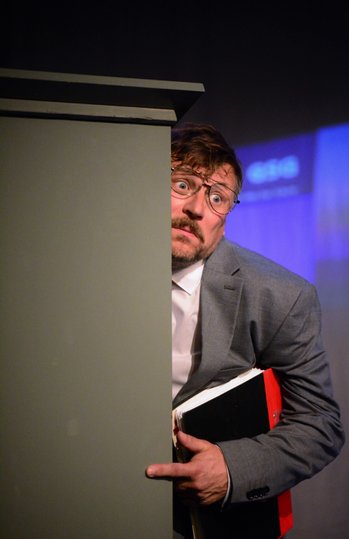 . Grandiost återges hur rollfiguren kommenterar kollegers göranden och låtanden, hur dessa påverkar den ”drabbade” berättaren. Han avslöjar sig som en tickande bomb vars skarpa noteringar inlagda i protokoll, blir dennes metod att stå ut, att i tysthet skriva av sig sin ilska. Ska påpekas att Hedén knappt har någon scenografi att hänga upp texten på. En talarstol vars höjd den kortväxte stackaren inte förmår justera (ingår i scenanvisningarna) och en vit duk visandes första sidan av efterfrågad power point, vars bilder den ömklige Mats Norlén misslyckas helt med att ta fram.