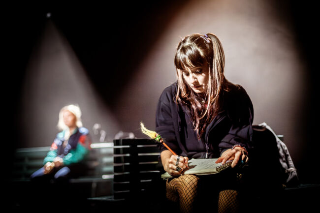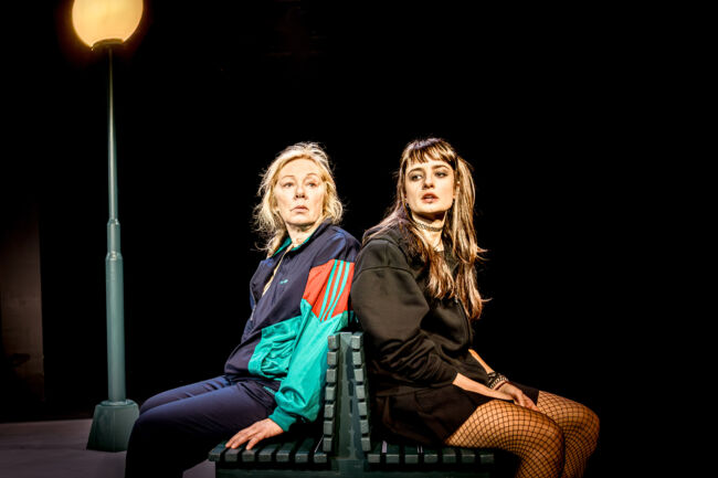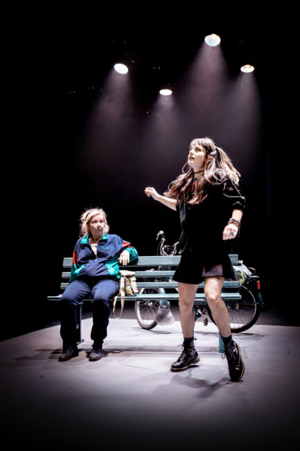 Med tanke på dramatikerns förkärlek för aparta individers slumpmässiga möten, kan det tyckas underligt att det här inte refereras till Nattorienterarna. Till skillnad från Vera och Bricken skiljer det två generationer emellan Alfhild (Marie Delleskog) och Camilla (Beata Hedman). Båda är på rymmen, verkar omgruppera och funderar på nästa destination när de träffas i en upplyst park med gröna bänkar. Den förra med cykel och packning på släp ska vara i 75-års åldern medan Camilla nog inte ens gått ut grundskolan. Dessa båda varelser har rymt, lämnat en tillvaro de inte stod ut med. Barnlösa sjuttifemåringen hävdar absurt nog att hon rymt från sin soffgrupp. Goth-tjejen har stuckit iväg från sin mamma och längtar efter pappan som tidigt övergav henne. I en sekvens menar hon att hon ägnar sig åt en samvetskonflikt av privat natur och inte får bli störd.
