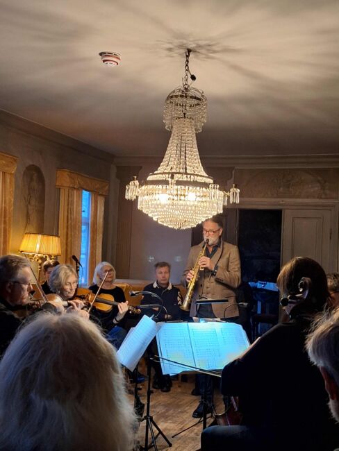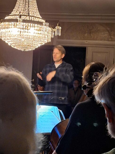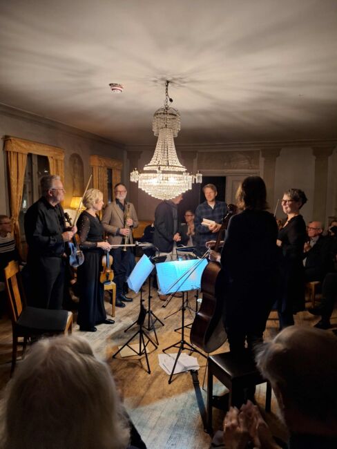 Underrubriken lyder ”en resa mellan klassiskt och jazz” . Tonsättaren som bjöd in träffade jag på jazzkrogen Utopia, ett stenkast från 1700-tals byggnad där programmet genomförs inför de femtio åhörare man har kapacitet för att ta emot. Den är en speciell känsla att träda in i denna kulturminnesmärkta interiör. Haft förmånen att ha varit här på minnesvärda konserter minst tre gånger senaste åren plus att jag genom VR-utrustning i hemmet såg Folkteaterns magiskt flerskiktade produktion av Dödsdansen inspelad i samma rum. Programmet denna söndagseftermiddag pågår halvannan timme, vilket känns alldeles lagom. Resonansen från de fem akustiska instrumenten var ypperlig. Som framgår av mina bilder satt publiken på stolar i ring runt utövarna. När man blir bjuden bör man om evenemanget i fråga exalterade utöver det vanliga, återgälda visad generositet genom att dokumentera upplevelsen, så som den utföll för en skrivande kulturkonsument utan adekvat kunskap.