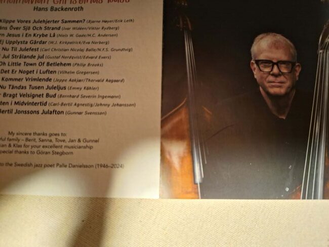 Hansen upptäcktes i tonåren på konsert i Karlstad med Nils-Henning Örsted Pedersen, basprofilen med vilken han fick sitt genombrott och ett musikaliskt partnerskap etablerades. Hansen var i många år ledare danska radions storband och har spelat med storheter som Miles Davis, Ben Webster och Dexter Gordon. Den tredje komponenten på Scandinavian Christmas Bass är Kristian Leth bakom trumsetet, vars leverans av rytmer man ofta hör i sällskap av Backenroth på kvartett eller trio. Oftast diskret handlar batteristens syssla här om att kompa inte bara ett utan två instrument inbegripna i att förädla melodier. I albumets finalnummer gästar Klas Lindquist på altsax som en hyllning till ”Dompan” med vilken Backenroth fick äran att samarbeta i nästan fjorton års tid. I den softa älskade signaturen till Tage Danielssons absurda julsaga blir det kvartettspel. Övriga tolv titlar framförs antingen på trio eller duo. Skivan tillägnas internationellt meriterade instrumentkollegan Palle Danielsson (1946-2024). Ett särskilt riktas till Göran Stegborn som ansvarat för mix, mastring och samtliga pålägg.