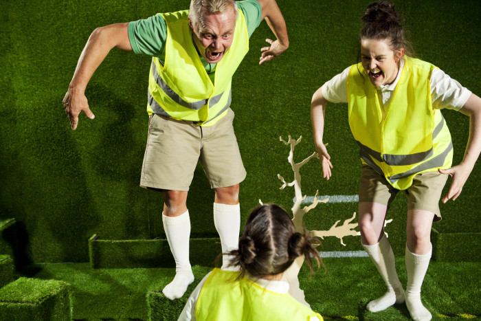 Vi leds in i omgångar till föreställningen, får sitta i strumplästen tätt intill varandra på bänkar. Hela scenrummet är täckt med grönt plastgräs. Vi tas emot av en trio skådespelare klädda i ljusa knästrumpor, bruna safarishorts och gula reflexvästar. De är minst sagt energiska och med mimik och gestik fångar de in betraktarna. Bara någon enstaka gång skruvar somliga på sig i den unga publiken. Anna Engberg och Jenny Nilsson har så snarlika utseenden att de skulle kunna vara tvillingar. De kompletterar varandra oerhört väl. Jan Coster, mycket meriterad från filmens värld, är ändå den av skådespelarna jag fäster mig mest vid. Han bottnar perfekt i pjäsens alla drastiska skiftningar. Engberg anför ensemblen i de fina vilopunkter som den drömska ibland lite kusliga musiken utgör. Ingen koreograf finns angiven, icke desto mindre är det mycket fart och fläkt. Man hoppar och skuttar, gör sig viga och krumma, blir skrämda och förvånade. Och de lämnar oss i livets slutskede krypandes genom en lucka.