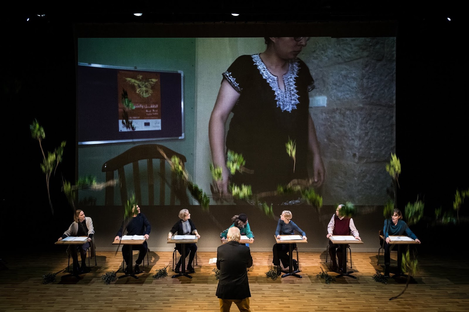 När Aischylos skrev denna tragedi framfördes scenkonst av en kör. Aischylos tros vara den som utvecklade dramat på scen med en skådespelare. I regi av den skotske dramatikern David Greig bibehålls formen med kör på ett smart sätt. Sju svenska skådespelare sitter vid var sitt litet bord och nio skådespelerskor från Palestina medverkar på länk och syns på en stor digital skärm. Tillsammans blir dessa svenska och palestinska skådespelare kören. Det fungerar starkt, mycket bra.